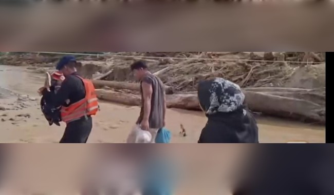 Dalam sebuah insiden dramatis di Kecamatan Batang Toru, Tapanuli Selatan, seorang anggota Brimob terlihat menggendong seorang bayi menyeberangi jembatan darurat yang hampir roboh diterpa derasnya arus sungai pascabanjir.