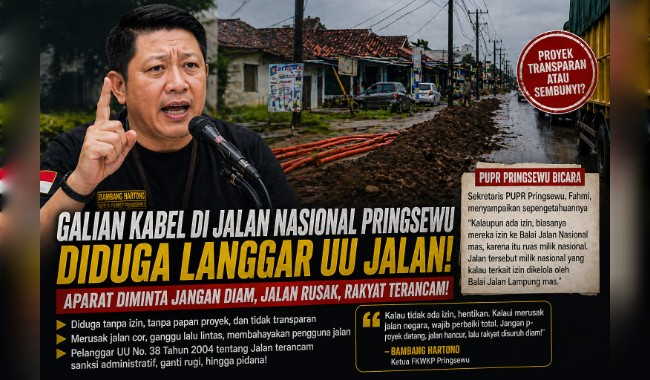 Pringsewu | Aktivitas penggalian kabel fiber optik di ruas Jalan Ahmad Yani, Sidoharjo, Kabupaten Pringsewu, memicu kemarahan masyarakat.