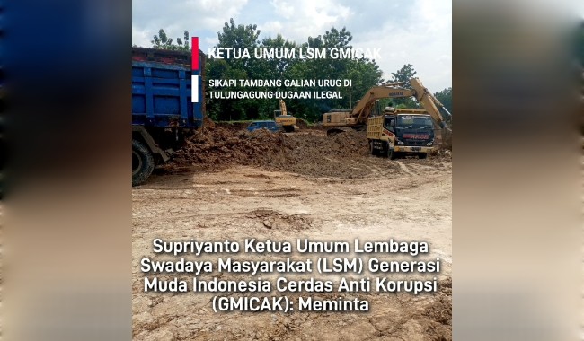 Tulungagung | Berdasarkan laporan informasi dan hasil pendataan tambang galian Urug dugaan ilegal di Desa Karanganom, Kecamatan Kauman, Kabupaten Tulungagung, Provinsi Jawa Timur Lembaga Swadaya Masyarakat (LSM) Generasi Muda Indonesia Cerdas Anti Korupsi (GMICAK) berdasarkan hasil investigasi Dan Konfirmasi melalui Nomor : 219/LSM – GMICAK/ III/2026