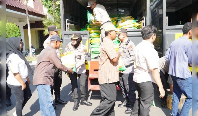Pada kegiatan ini, Polda Jatim menyalurkan 1.050 paket beras SPHP masing-masing seberat 5 kilogram dan 1.000 liter minyak goreng merek Kita.